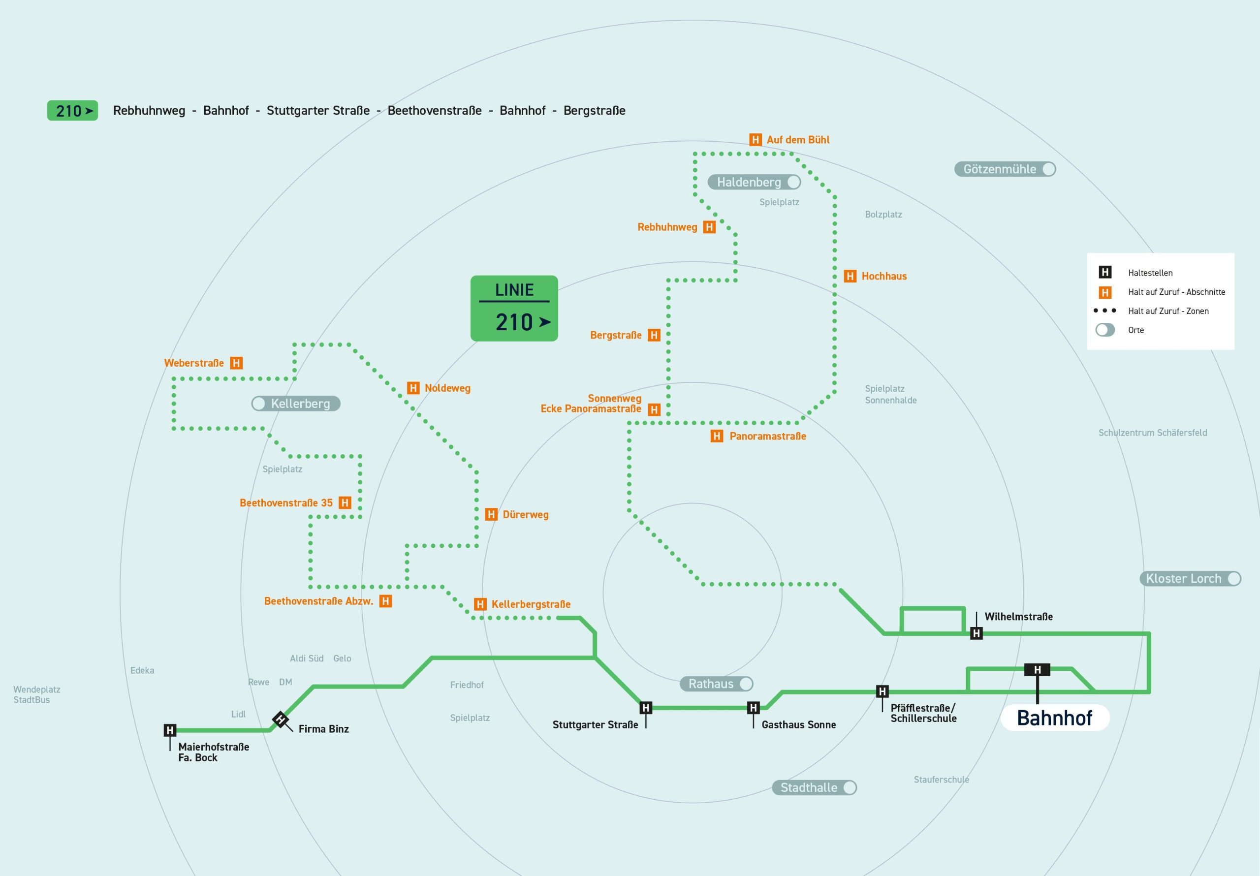 Rebhuhnweg – Bahnhof – Stuttgarter Straße – Beethovenstraße – Bahnhof – Bergstraße